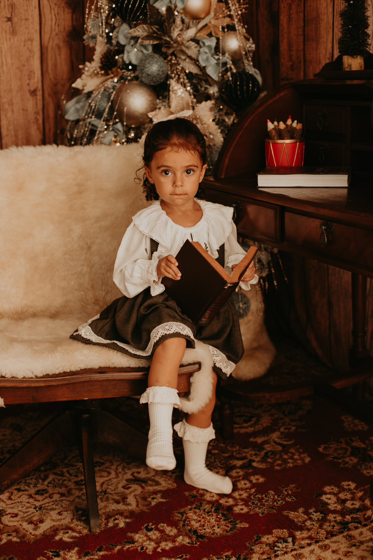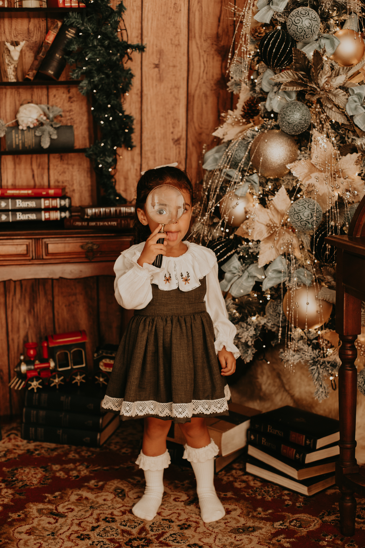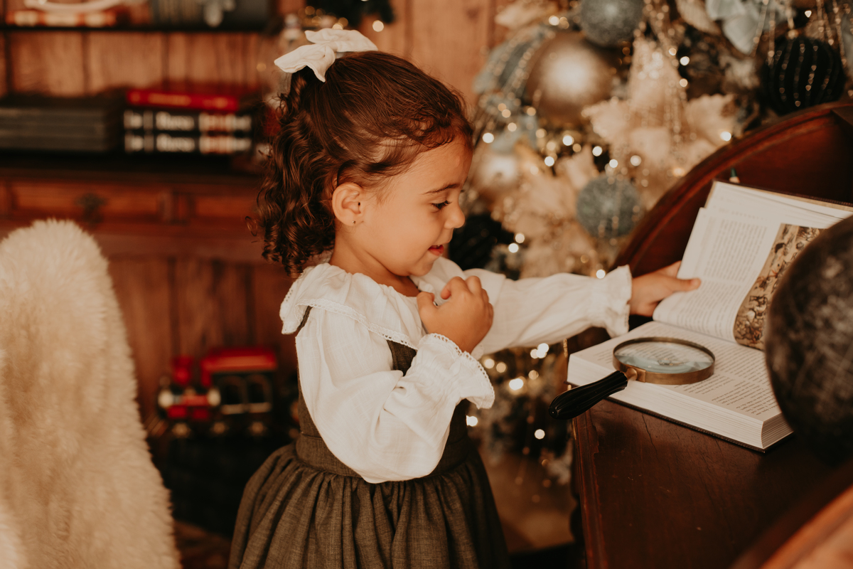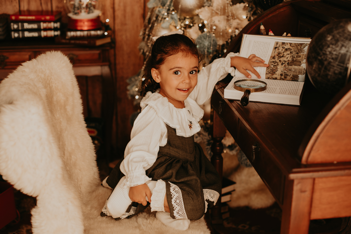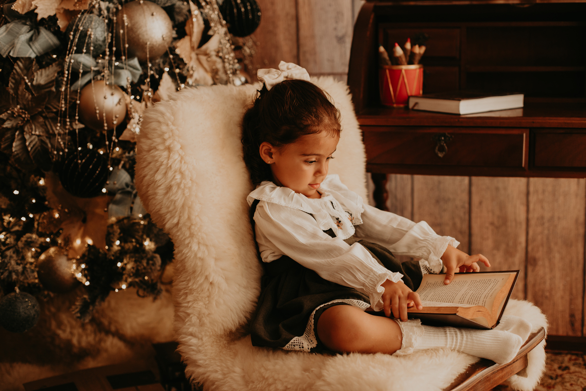 Na cabana de livros, Eloá se aconchega ao lado da árvore de Natal iluminada. Cada história ao seu redor brilha tanto quanto os enfeites, e a imaginação dela a leva para lugares encantados . É como se as palavras dos livros ganhassem vida e dançassem no ar, acompanhando o som distante dos sinos. Com o olhar curioso e a mente aberta, ela descobre que o Natal é muito mais do que presentes — é uma jornada encantada que começa com o simples virar de uma página.